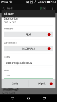 Pokud se i přes všechny správně nastavené možnosti nemůžete připojit stáhněte si z obchodu Play aplikaci Geteduroam a připojte se přes ní. https://play.google.com/store/search?q=geteduroam&c=apps